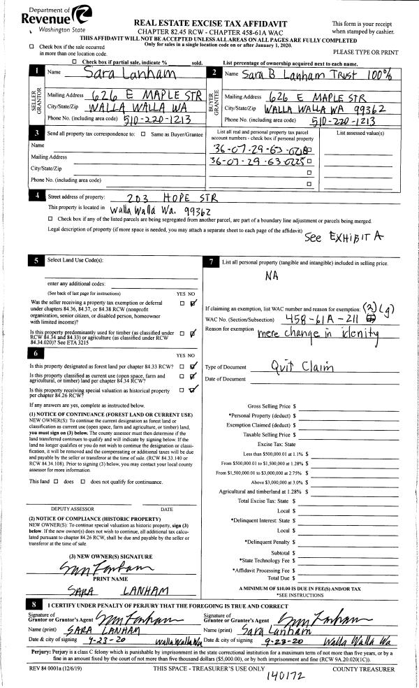 | 2 | 10/23/2020 | QCD | QUIT CLAIM DEED | LANHAM SARA | LANHAM SARA B TRUST | | | | 140172 | 2020-11034 |