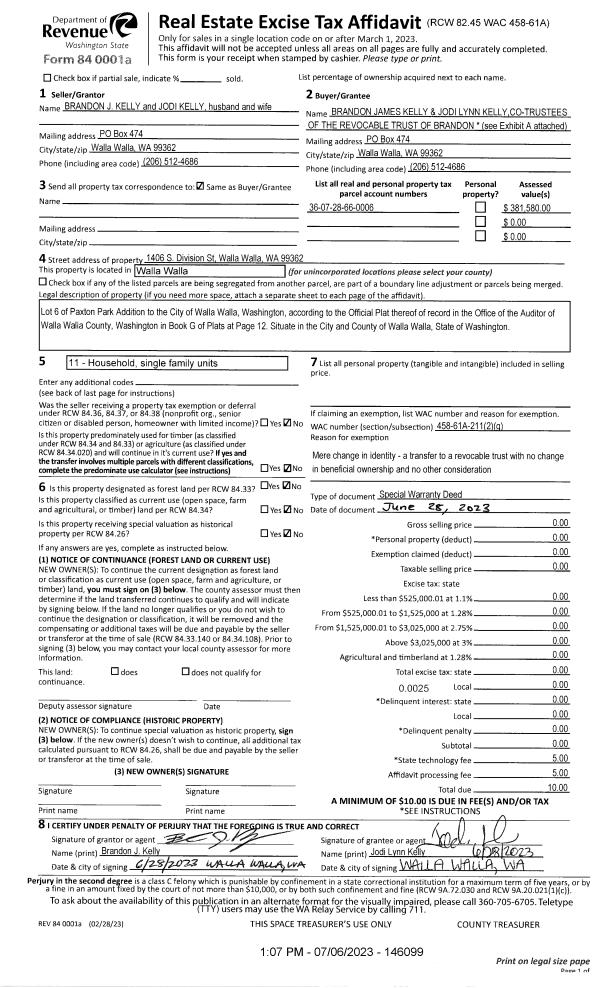 | Mailing Address: | BRANDON JAMES & JODI LYNN KELLY TRUSTEES PO BOX 474 WALLA WALLA, WA 99362 | % Ownership: | 100.0000000000% |