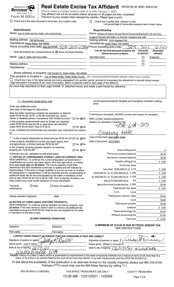 | 2 | 12/17/2021 | QCD | QUIT CLAIM DEED | GALLO JUDY K | DUNCAN WILLIAM & MURIEL | | | $0.00 | 143094 | 2021-14915 |
