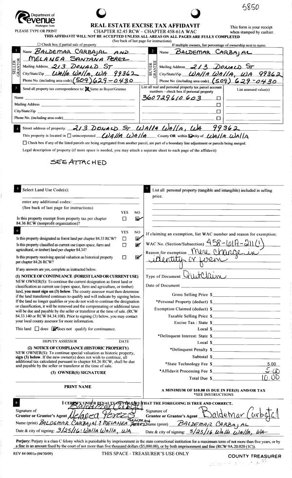 | 1 | 03/25/2016 | QCD | QUIT CLAIM DEED | CARBAJAL BALDEMAR | CARBAJAL BALDEMAR | | | $0.00 | 130249 | 2016-03770 |
