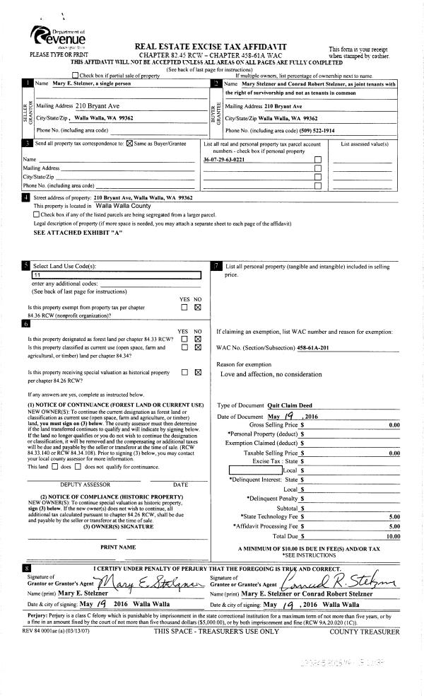 | 2 | 05/19/2016 | QCD | QUIT CLAIM DEED | STELZNER MARY E | STELZNER CONRAD ROBERT & MARY E | | | $0.00 | 130245 | 2016-03752 |