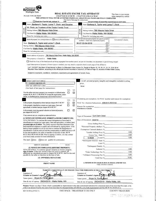 | 3 | 09/23/2019 | QCD | QUIT CLAIM DEED | TAYLOR FAMILY TRST AGREEMENT | TAYLOR BARBARA K 50% | | | $0.00 | 137743 | 2019-07555 |