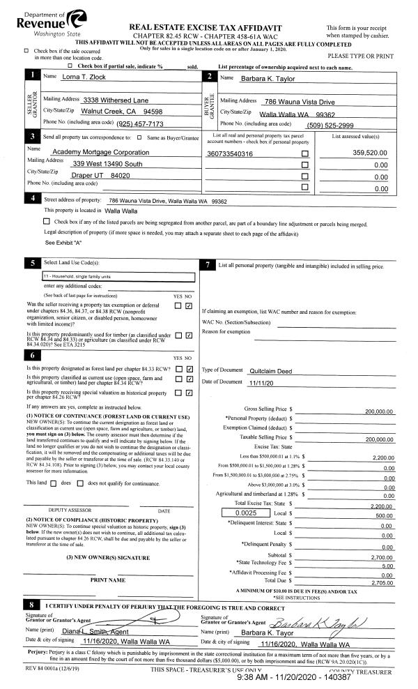 | 2 | 11/20/2020 | QCD | QUIT CLAIM DEED | TAYLOR BARBARA K 50% | TAYLOR BARBARA K | | | $200,000.00 | 140387 | 2020-12279 |