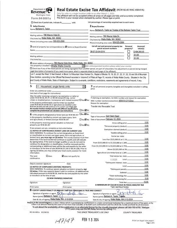 | 1 | 02/13/2024 | QCD | QUIT CLAIM DEED | TAYLOR BARBARA K | TAYLOR BARBARA TRUST | | | | 147147 | 2024-00783 |