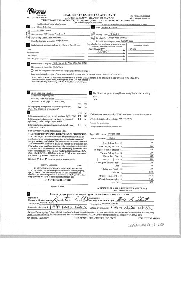 | 4 | 11/14/2014 | TRUSTEES D | TRUSTEE'S DEED | SCHMATT CHRISTINA | SCHMATT MICHAEL A | | | $208,360.00 | 126938 | 2014-08279 |