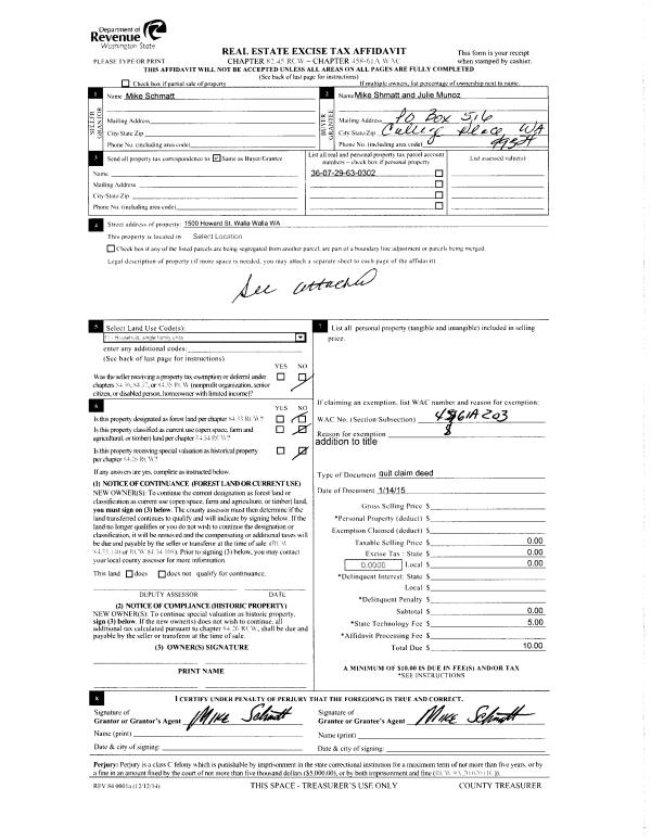| 3 | 01/14/2015 | QCD | QUIT CLAIM DEED | SCHMATT MICHAEL A | SHMATT MIKE | | | $0.00 | 127274 | 2015-00340 |