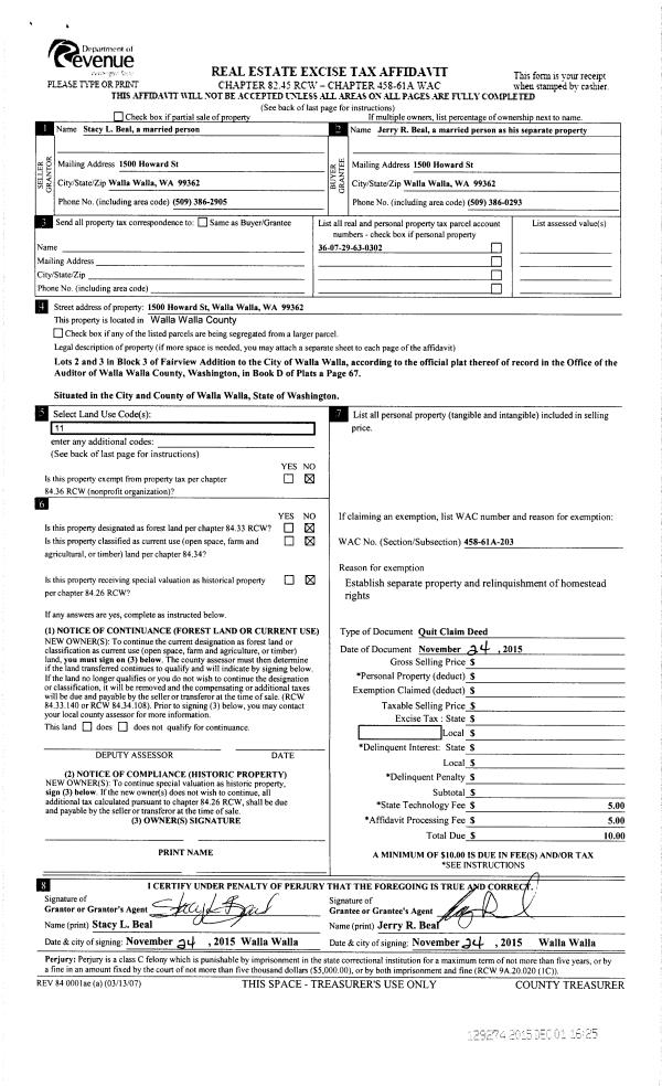 | 1 | 11/24/2015 | QCD | QUIT CLAIM DEED | BEAL STACY L | BEAL JERRY R | | | | 129274 | 2015-10325 |