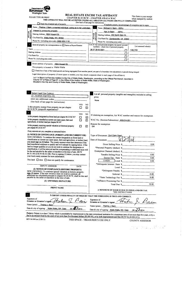 | 3 | 06/27/2014 | QCD | QUIT CLAIM DEED | BAIM ALLEN L & THELMA HILL | BAIM ALLEN | | | $0.00 | 126147 | 2014-04462 |
