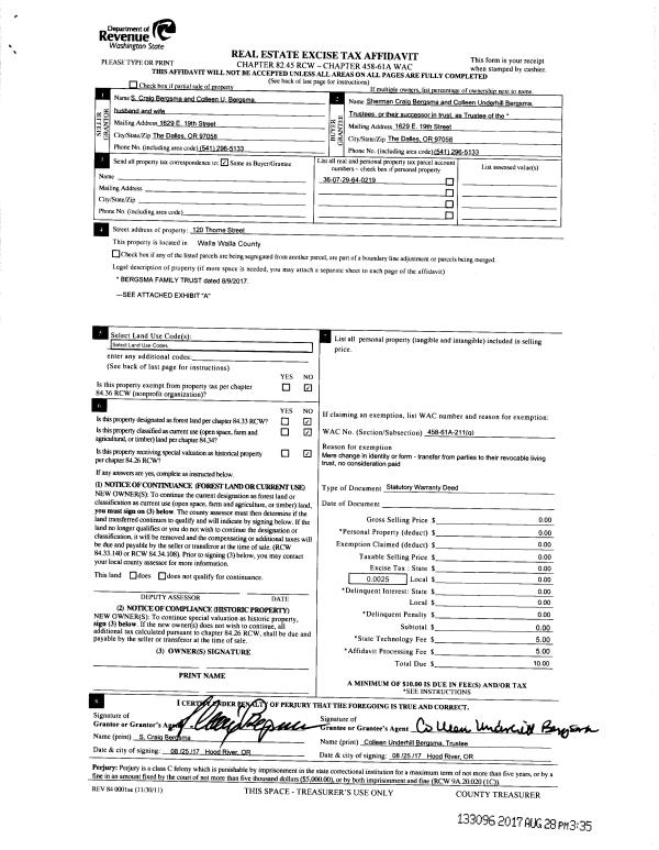 | 5 | 08/25/2017 | SWD | STATUTORY WARRANTY DEED | BERGSMA S CRAIG | BERGSMA FAMILY TRUST | | | $0.00 | 133096 | 2017-06746 |