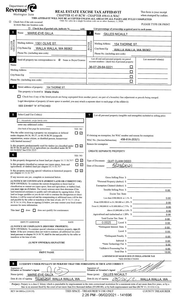 | 1 | 06/02/2021 | QCD | QUIT CLAIM DEED | GILLA MARIE-EVE | NICAULT GILLES | | | | 141696 | 2021-06697 |