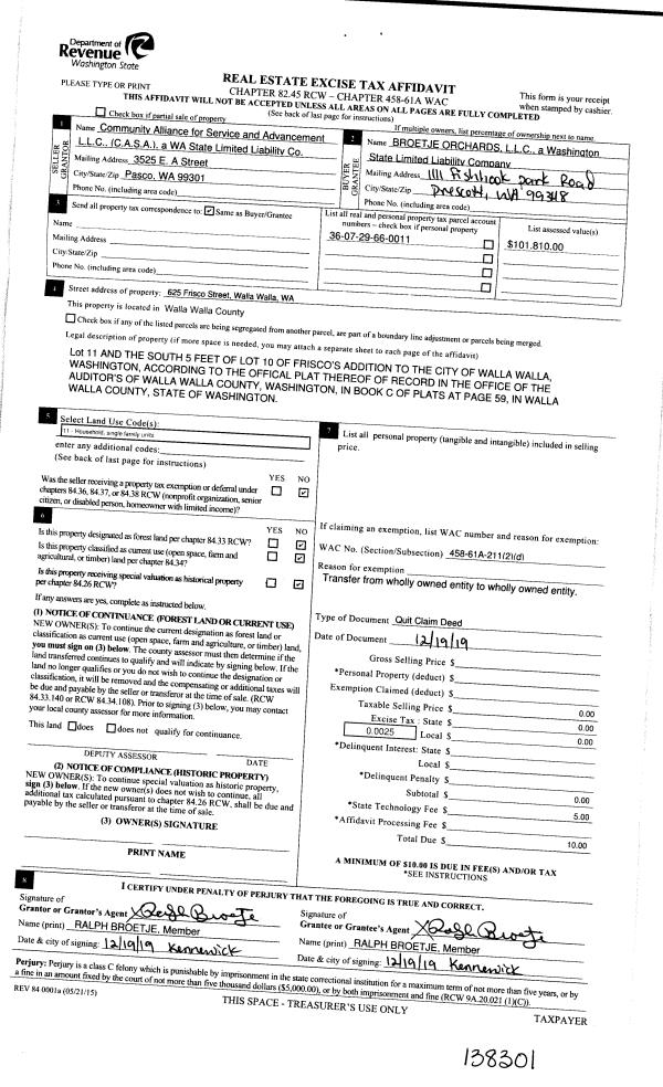 | 2 | 12/19/2019 | QCD | QUIT CLAIM DEED | C A S A LLC | BROETJE ORCHARDS LLC | | | $0.00 | 138301 | 2019-10627 |