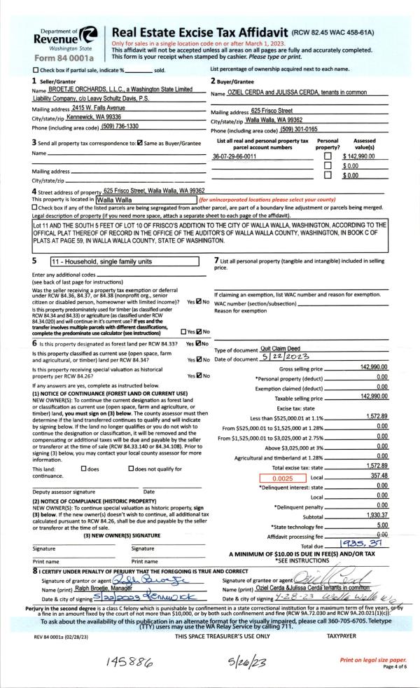 | 1 | 05/26/2023 | QCD | QUIT CLAIM DEED | BROETJE ORCHARDS LLC | CERDA OZIEL & JULISSA | | | $142,990.00 | 145886 | 2023-02890 |