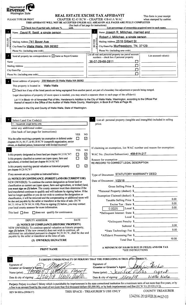 | 2 | 02/26/2018 | SWD | STATUTORY WARRANTY DEED | SEIDL DAVID | MILLICHAP JOSEPH R | | | | 134206 | 2018-01526 |