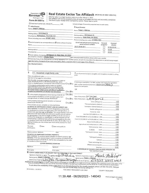 | 1 | 06/26/2023 | QCD | QUIT CLAIM DEED | MILLICHAP JOSEPH R | MILLICHAP ROBERT J | | | $0.00 | 146043 | 2023-03526 |