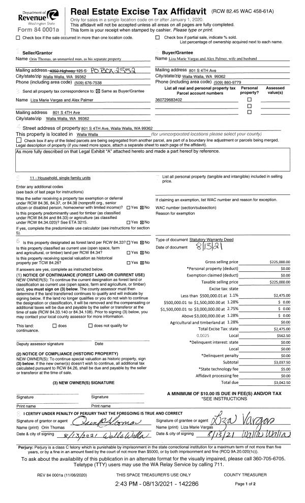 | 1 | 08/13/2021 | SWD | STATUTORY WARRANTY DEED | THOMAS ORIN | VARGAS LIZA MARIE & ALEX PALMER | | | $225,000.00 | 142286 | 2021-09894 |