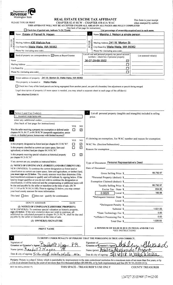 | 2 | 05/17/2018 | DPR | DEED OF PERSONAL REPRESENTATIVE | HAGEN PARNELL N ESTATE OF | NELSON MARSHA J | | | $66,793.00 | 134727 | 2018-03886 |