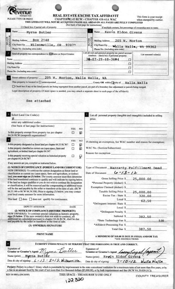 | 2 | 07/10/2012 | WARRANTY D | WARRANTY DEED | BUTLER, MYRNA | GIVENS, KEVIN ELDON | | | $25,000.00 | 122320 | 2012-05838 |