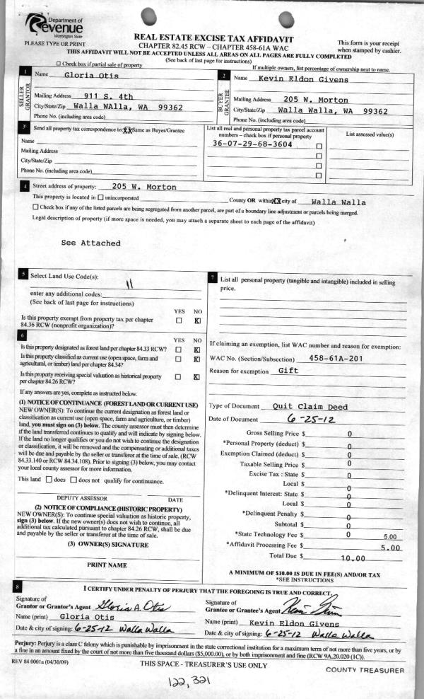 | 1 | 07/10/2012 | QCD | QUIT CLAIM DEED | OTIS, GLORIA | GIVENS, KEVIN ELDON | | | $0.00 | 122321 | 2012-05837 |