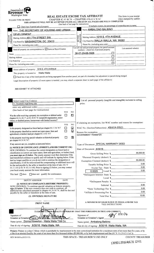 | 1 | 08/31/2016 | SWP | Special Warranty Deed | SECRETARY OF HOUSING & URBAN DEVELOPMENT | BALBINO AMBALONG | | | $55,000.00 | 130931 | 2016-07041 |