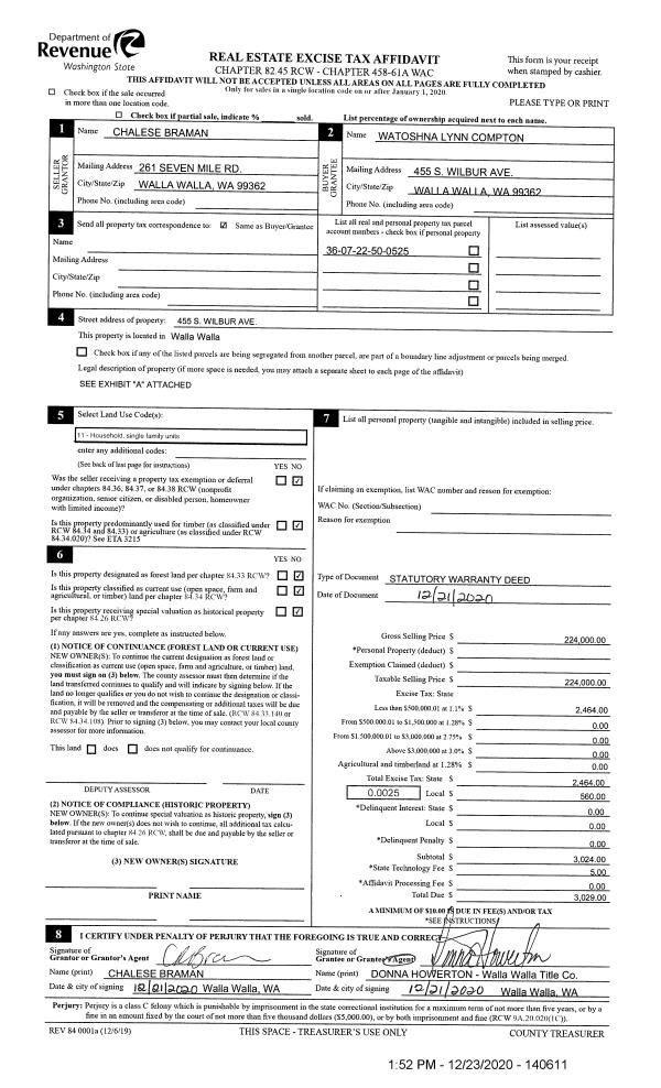 | 1 | 12/23/2020 | SWD | STATUTORY WARRANTY DEED | RABIDUE CHALESE R | COMPTON WATOSHNA LYNN | | | $224,000.00 | 140611 | 2020-13730 |