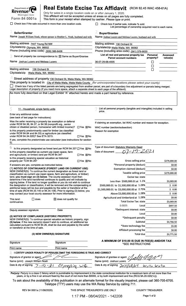 | 1 | 08/04/2021 | SWD | STATUTORY WARRANTY DEED | NOAH JOSEPH WILLIAM | LUCERO JOSHUA & MELISSA | | | $279,000.00 | 142208 | 2021-09479 |