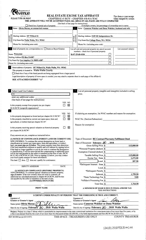 | 4 | 02/20/2018 | REAL ESTAT | REAL ESTATE CONTRACT | MORAN OLIVIA R | WALCKER CAMERON & DANA | | | $115,000.00 | 134181 | 2018-01418 |