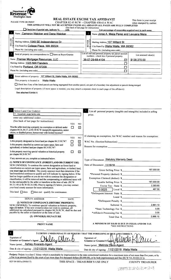 | 2 | 11/21/2018 | SWD | STATUTORY WARRANTY DEED | WALCKER CAMERON & DANA | PEREZ JORGE A MEJIA & LEXUANA MEJIA | | | $187,000.00 | 135975 | 2018-09653 |