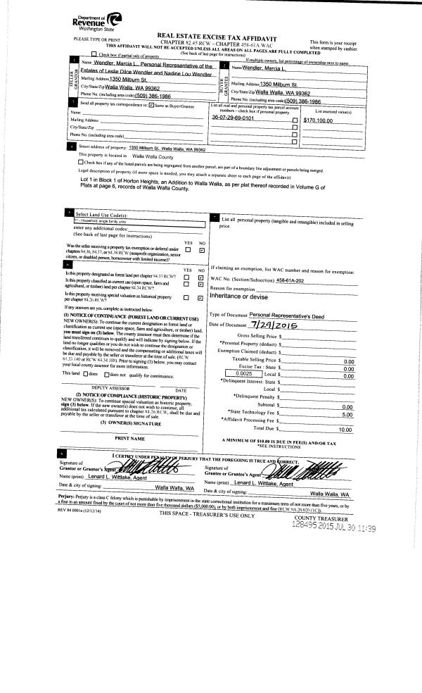 | 1 | 07/29/2015 | DPR | DEED OF PERSONAL REPRESENTATIVE | WENDLER LESLIE D ESTATE OF | WENDLER MARCIA L | | | $0.00 | 128495 | 2015-06527 |