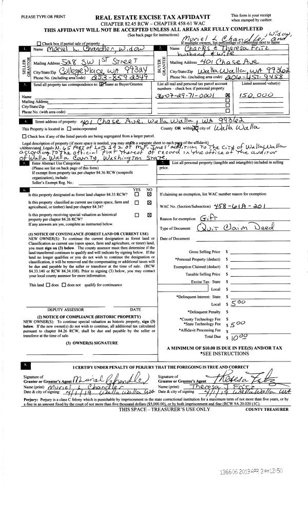 | 5 | 04/01/2019 | QCD | QUIT CLAIM DEED | CHANDLER MURIEL | FRITZ CHARLES & THERESA | | | $0.00 | 136606 | 2019-02084 |