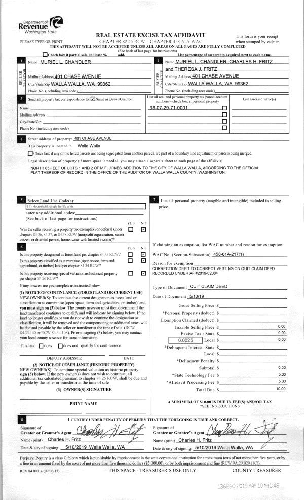 | Mailing Address: | CHARLES H & THERESA J FRITZ 401 CHASE AVE WALLA WALLA, WA 99362 | % Ownership: | 100.0000000000% |
