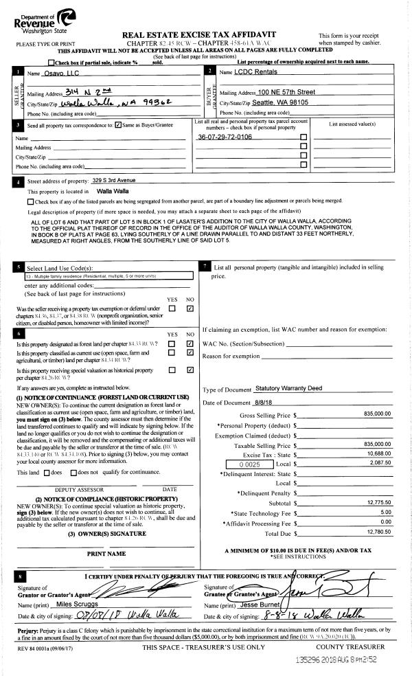 | 1 | 08/08/2018 | SWD | STATUTORY WARRANTY DEED | OSAVO LLC | LCDC RENTALS LLC | | | $835,000.00 | 135296 | 2018-06493 |