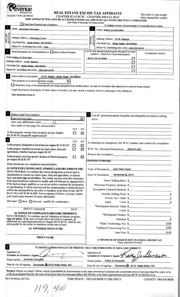 | 4 | 12/06/2010 | QCD | QUIT CLAIM DEED | GONZALEZ, JEREMIAH | GONZALEZ, KATHY JO | | | | 119410 | 2010-10031 |