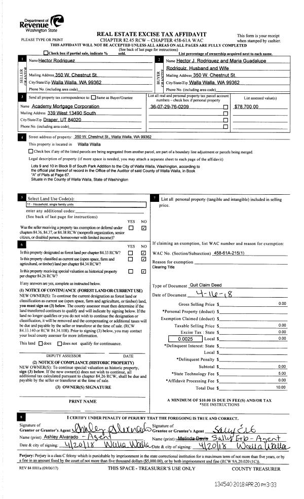 | 1 | 04/20/2018 | QCD | QUIT CLAIM DEED | RODRIGUEZ HECTOR | RODRIGUEZ HECTOR J & MARIA GUADALUPE | | | $0.00 | 134540 | 2018-03110 |