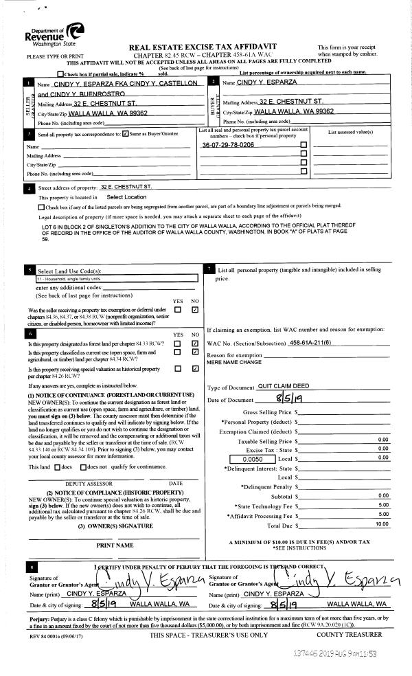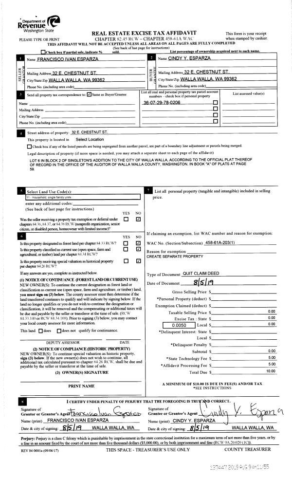 | 3 | 08/05/2019 | QCD | QUIT CLAIM DEED | ESPARZA FRANCISCO IVAN | ESPARZA CINDY Y | | | $0.00 | 137447 | 2019-05929 |