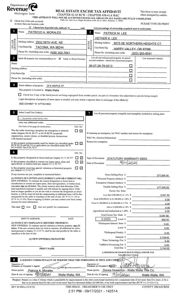 | 1 | 09/17/2021 | SWD | STATUTORY WARRANTY DEED | MORALES PATRICIO A | LEE PATRICK M & HETHER K | | | $277,000.00 | 142514 | 2021-11487 |
