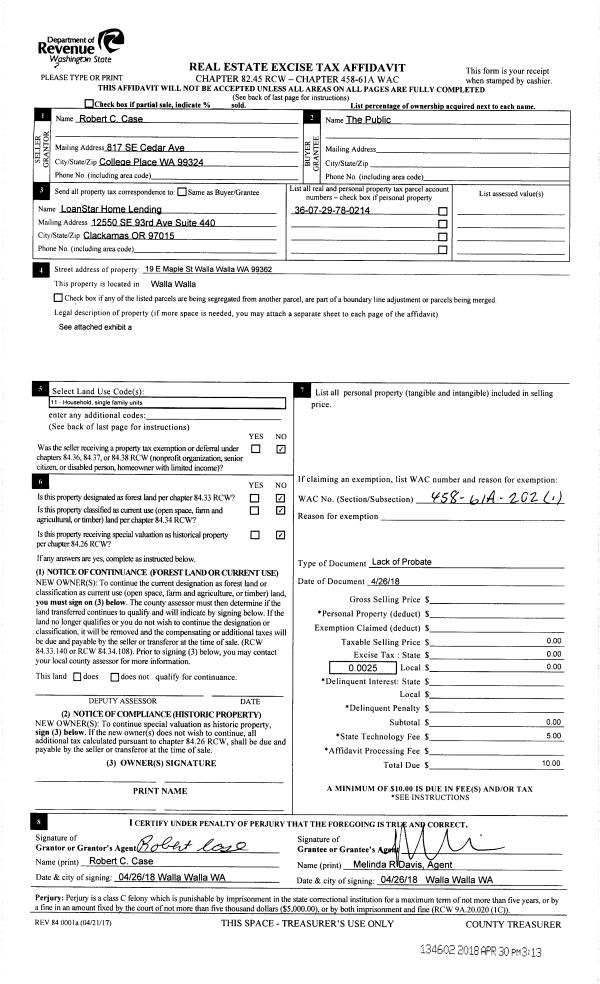 | 2 | 04/30/2018 | AFFIDAVIT | AFFIDAVIT | CASE ROBERT A | PUBLIC COMMUNITY AT LARGE THE (TOUCHET CEMETERY) | | | | 134602 | 2018-03389 |