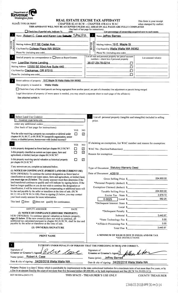 | 1 | 04/30/2018 | SWD | STATUTORY WARRANTY DEED | CASE ROBERT A | BARNES JEFFREY | | | $224,900.00 | 134603 | 2018-03390 |