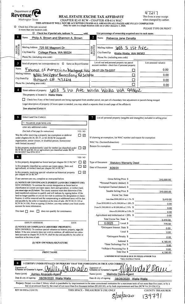 | 2 | 08/28/2020 | SWD | STATUTORY WARRANTY DEED | BROWN PHILIP A & SHANNON A | ZANATTA REBECCA JANE | | | $310,000.00 | 139791 | 2020-08675 |
