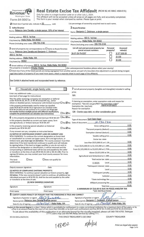 | 1 | 10/31/2024 | QCD | QUIT CLAIM DEED | ZANATTA REBECCA JANE | ZANATTA REBECCA JANE & BENJAMIN C DICKINSON | | | | 148452 | 2024-06369 |