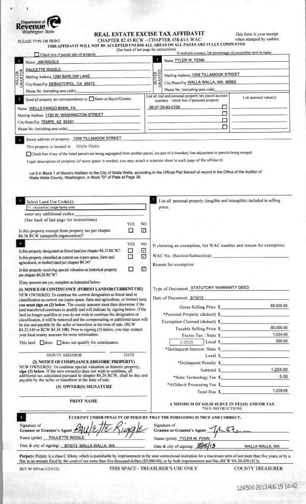| 3 | 08/19/2013 | WARRANTY D | WARRANTY DEED | RIGGLE, JIM & PAULETTE | FENN, TYLER W | | | $80,000.00 | 124500 | 2013-08496 |