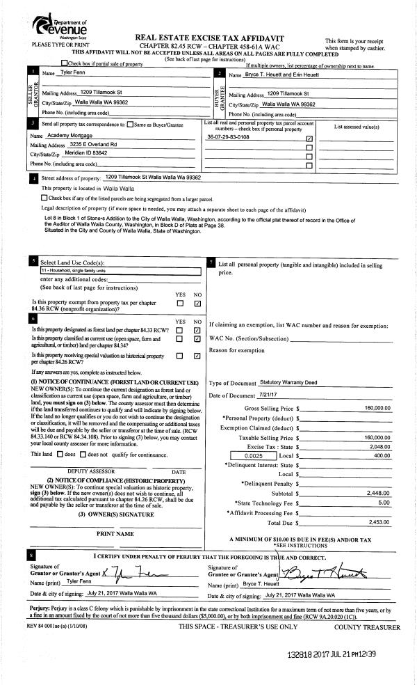 | 2 | 07/21/2017 | SWD | STATUTORY WARRANTY DEED | FENN TYLER W | HEUETT BRYCE T & ERIN K | | | $160,000.00 | 132818 | 2017-05571 |