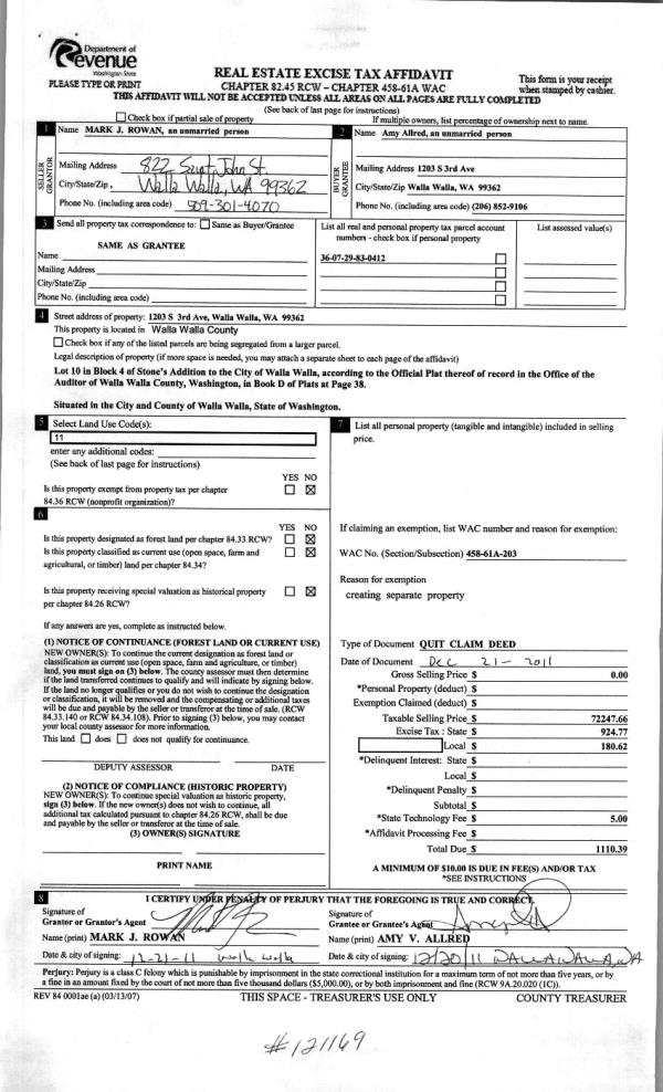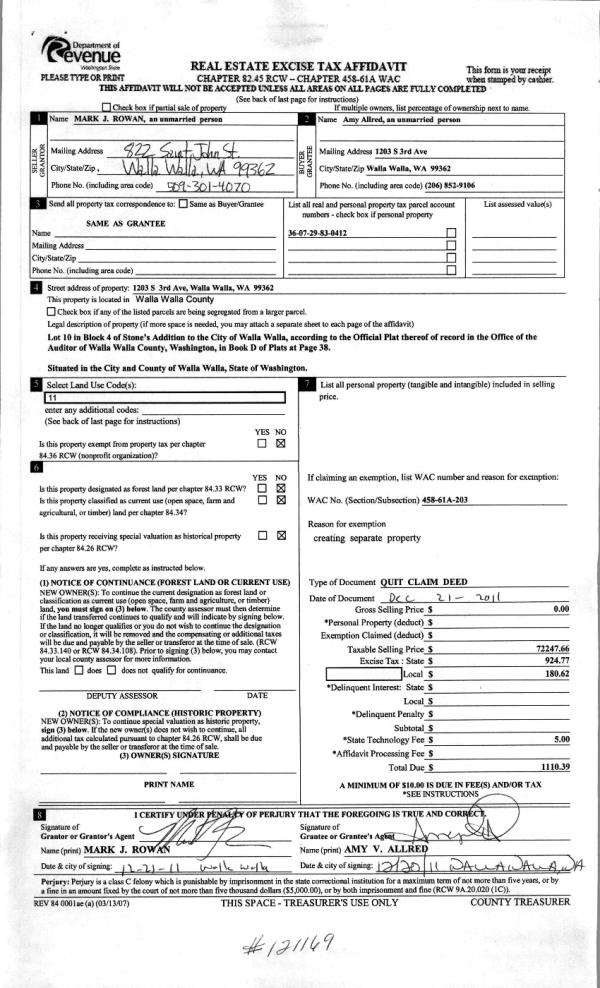 | 1 | 12/27/2011 | QCD | QUIT CLAIM DEED | ROWAN, MARK J | ALLRED, AMY V | | | | 121169 | 2011-10164 |