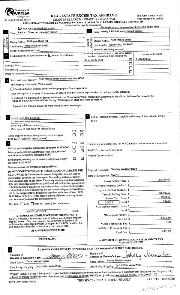 | 1 | 04/30/2014 | SWD | STATUTORY WARRANTY DEED | CHASE PATRICK L | KIMBALL WENDY R | | | $205,000.00 | 125806 | 2014-02932 |