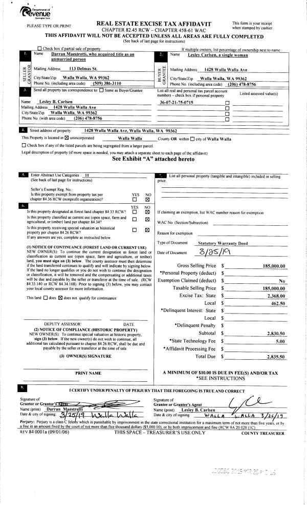 | 1 | 03/26/2019 | SWD | STATUTORY WARRANTY DEED | MAESTRETTI DARRAN | CARLSEN LESLEY | | | $185,000.00 | 136566 | 2019-01905 |