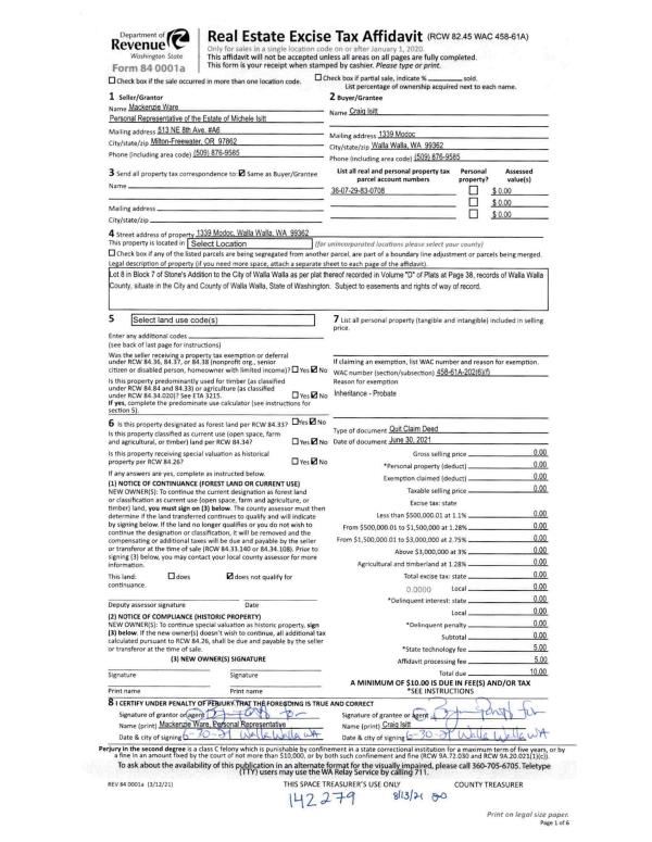 | 3 | 07/30/2021 | QCD | QUIT CLAIM DEED | ISITT MICHELE C ESTATE OF | ISITT CRAIG | | | $0.00 | 142279 | 2021-09883 |