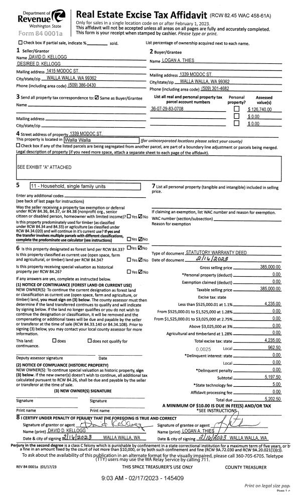 | 1 | 02/17/2023 | SWD | STATUTORY WARRANTY DEED | KELLOGG DAVID D & DESIREE D | THIES LOGAN A | | | $385,000.00 | 145409 | 2023-00809 |