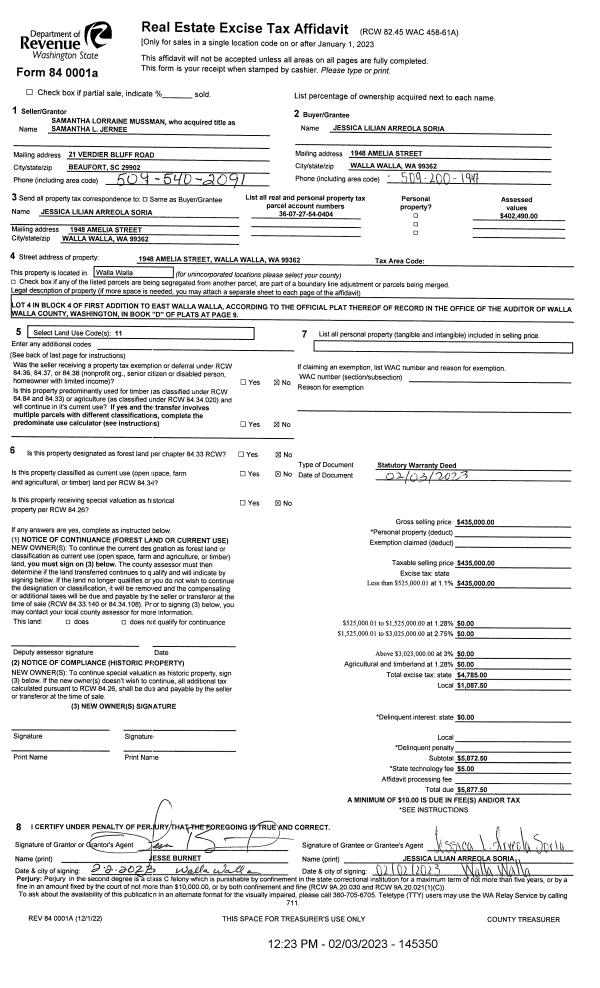 | 1 | 02/03/2023 | SWD | STATUTORY WARRANTY DEED | MUSSMAN SAMANTHA L | SORIA JESSICA LILIAN ARREOLA | | | $435,000.00 | 145350 | 2023-00553 |