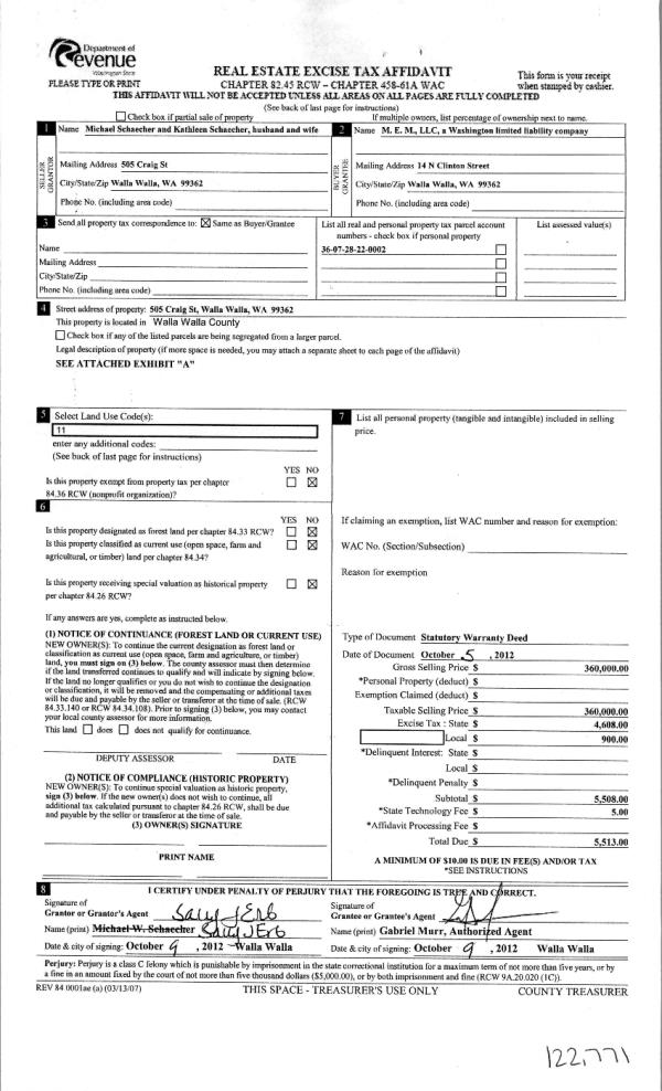 | 3 | 10/09/2012 | WARRANTY D | WARRANTY DEED | SCHAECHER, MICHAEL W & KATHLEE | M.E.M. LLC | | | $360,000.00 | 122771 | 2012-08897 |