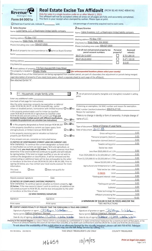 | 1 | 10/19/2023 | OCN | ORDER CHGING NAME | LUCID FARMS LLC | VABRE INVESTORS LLC | | | | 146659 | 2023-06153 |