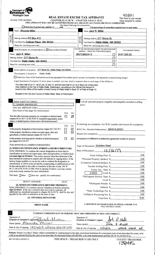 | 1 | 12/16/2019 | QCD | QUIT CLAIM DEED | MILLER JACK R & RHONDA | MILLER JACK R | | | $0.00 | 138445 | 2020-00441 |